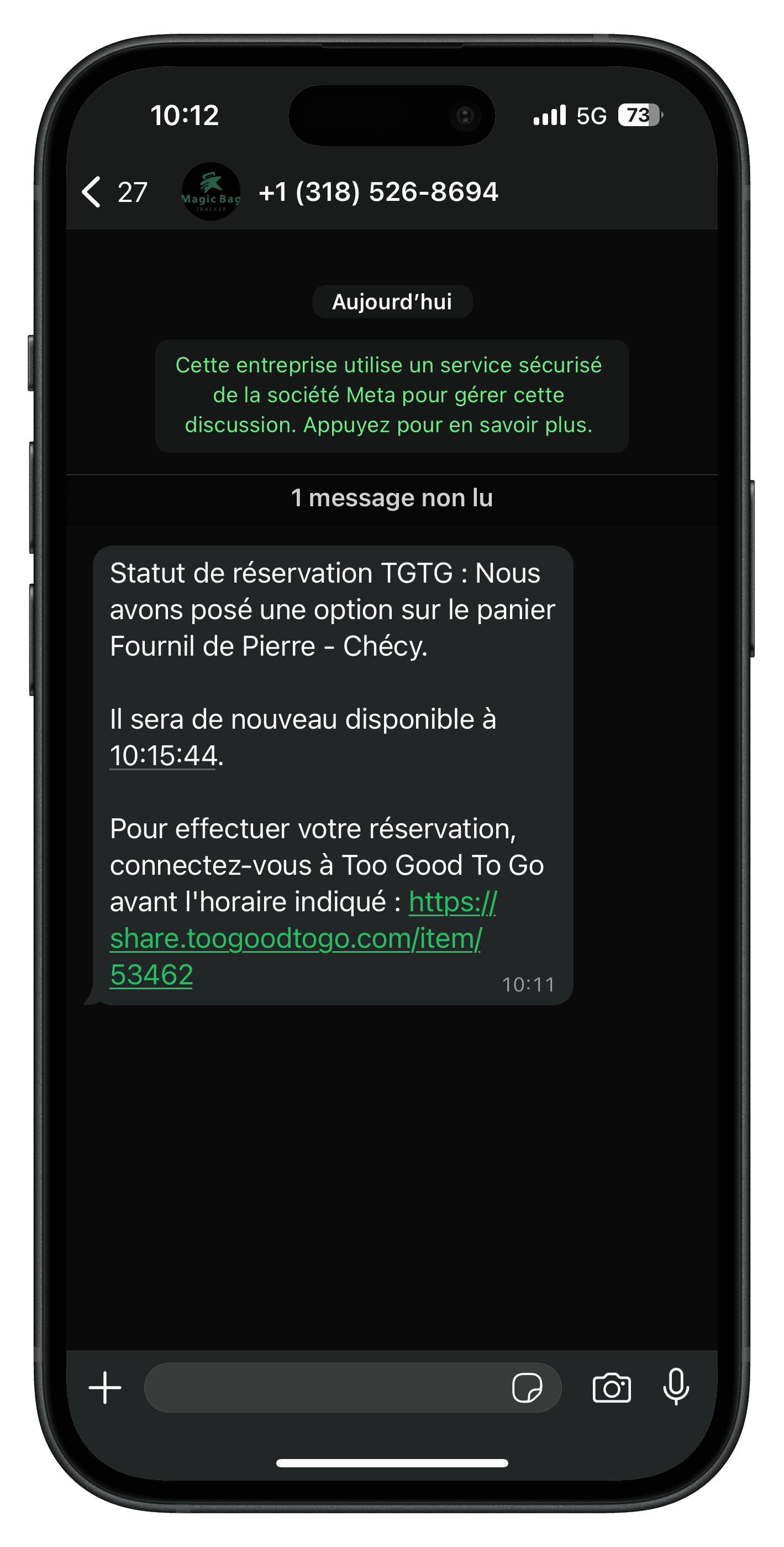 Vous recevez une notification WhatsApp dès qu'un panier est disponible, avec un lien direct vers le panier.